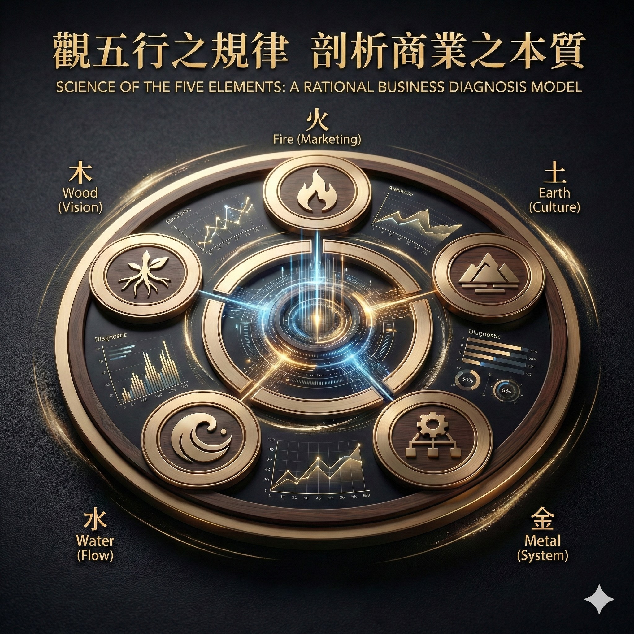 「觀五行之規律,剖析商業之本質。」 深入剖析「木、火、土、金、水」五大元素在企業經營中的動態平衡。我們不談空泛的理論,而是將感性的東方智慧轉化為科學診斷模型,為企業的願景、營銷、文化、制度與流動性提供理性的解析框架。