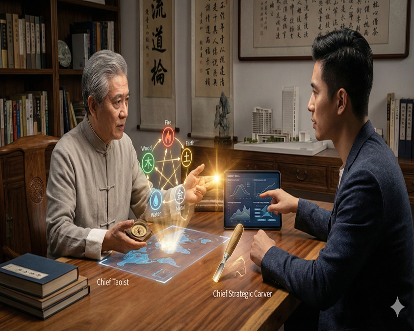 「跨越世代的智慧碰撞,定調未來的戰略火花。」 本專欄由「首席道長」「首席戰略雕刻師」親自執筆。透過跨世代的對談,我們探討如何將古老的「五行規律」應用於瞬息萬變的數位市場,展示從傳統工藝轉型至現代顧問的思考演進。